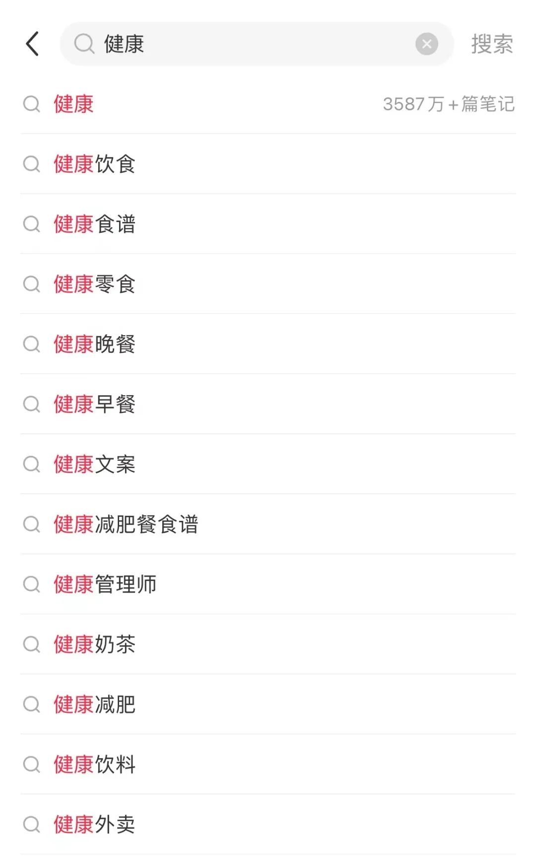 打开小红书,目前与“健康”相关的笔记高达3,587万 ,其中,与“吃”相关的信息占了很大一部分。这说明公众对健康的需求和实践变得更加日常化。“不顾一切”的年轻人希望通过发现新的健康食品、了解饮食搭配技巧、学习如何制作健康的饭菜来改善自己的健康状况。