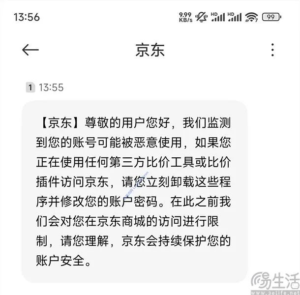 在这条短信中,JD.COM解释说“监控用户账户可能被恶意使用”,但曝光后,有网友认为此举是JD.COM准备限制用户使用第三方比价工具或比价插件。