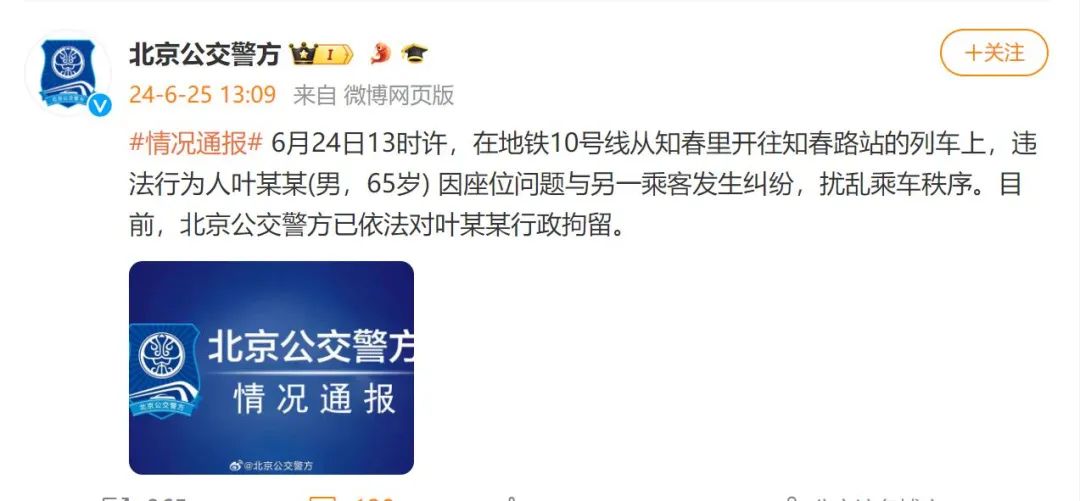 6月24日,13时许,在地铁10号线开往知春路站的火车上,因座位问题与另一名乘客发生纠纷,违法行为人叶某某(男,65岁)扰乱了乘车秩序。目前,北京公交警方已依法拘留叶某某。