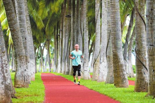 椰子树下延伸着一条全新的红色橡胶跑道,跑者们在跑道上挥汗如雨。记者 杨鹤 摄