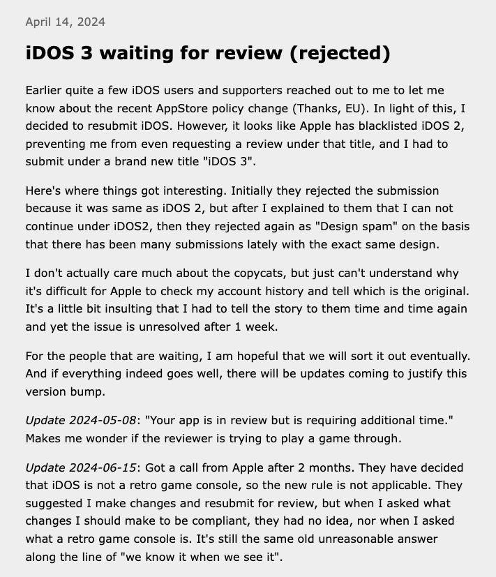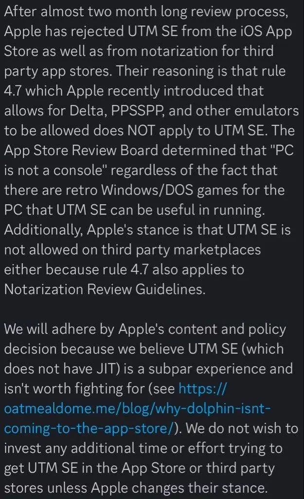 在 App Store 政策调整后, 苹果新的 App 审批指南允许复古游戏机模拟器 App 上架。但即便如此,苹果还是拒绝了。 iDOS 3 (DOS 模拟器)和 UTM SE(Windows 系统模拟器)的上架请求。