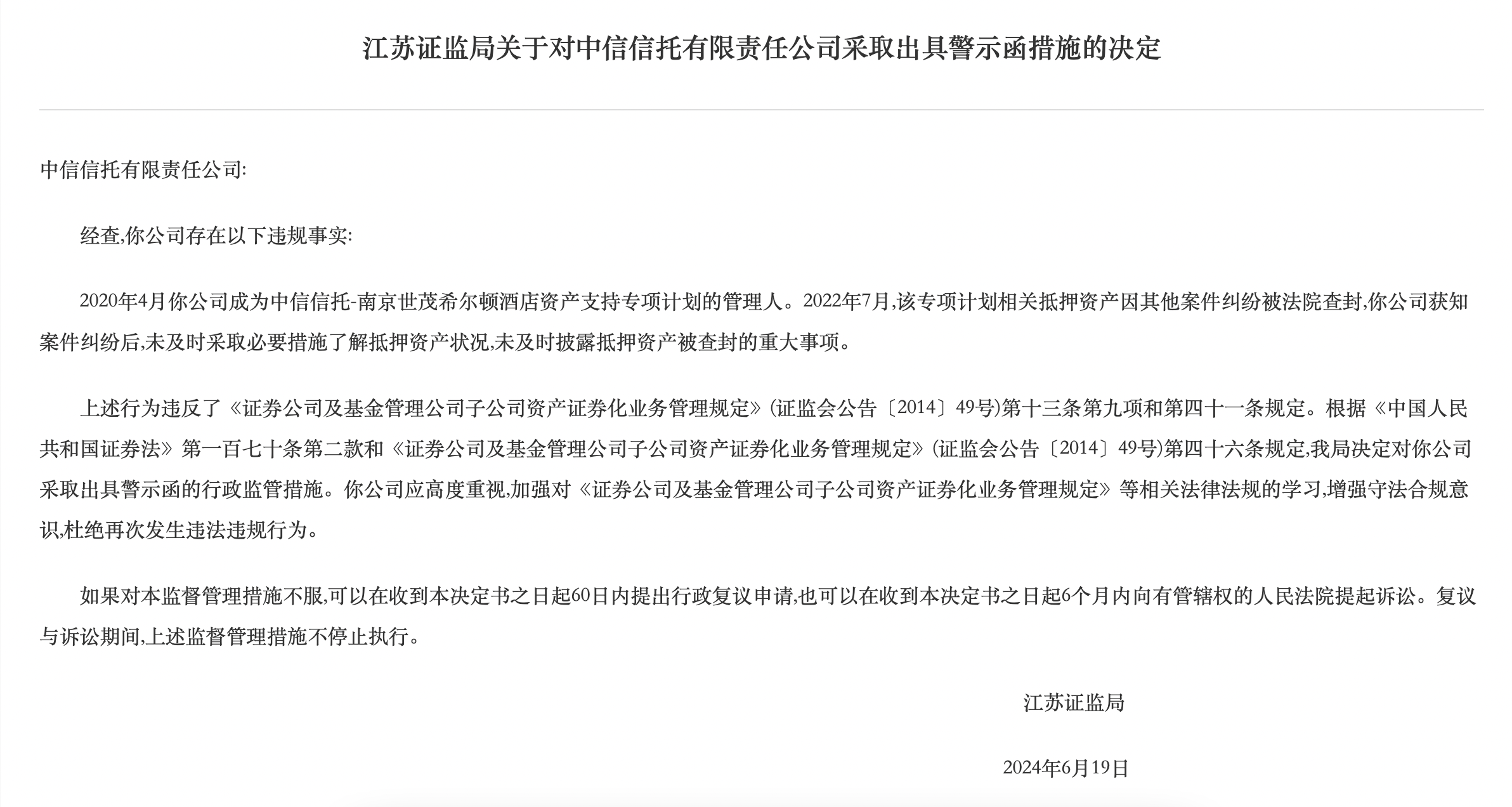 根据江苏证监局披露的信息,2020年4月,中信信托成为南京世茂希尔顿酒店资产支持专项计划经理。2022年7月,由于其他案件纠纷,该专项计划的抵押资产被法院查封。中信信托得知案件纠纷后,未能及时采取必要措施了解抵押资产状况,未能及时披露抵押资产被查封的重大事项。上述行为违反了有关证券化业务管理的规定,因此对其发出了警示函。