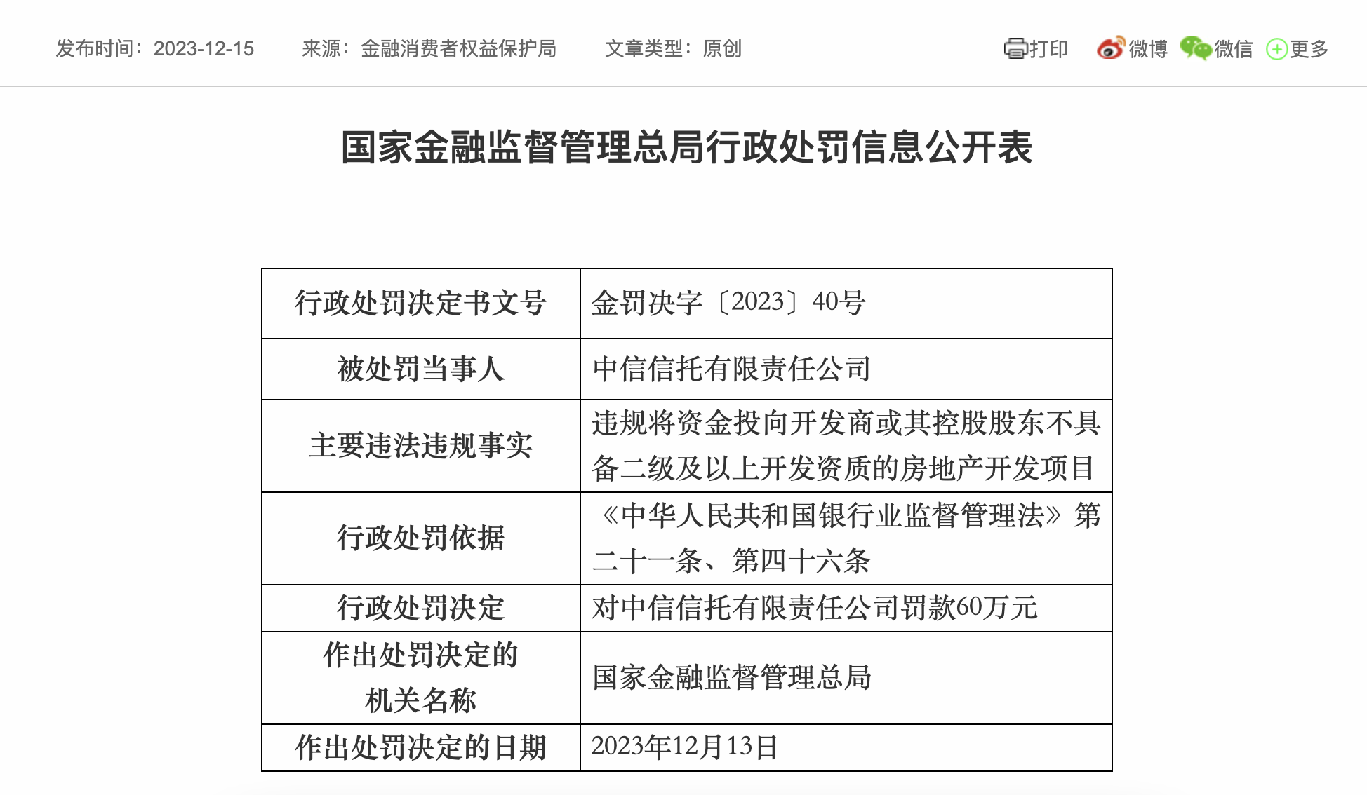 2023年12月,国家金融监督管理总局公开披露对中信信托有限公司的行政处罚信息。中信信托因“房地产开发项目违规将资金投入开发商或其控股股东不具备二级及以上开发资质”被罚款60万元。