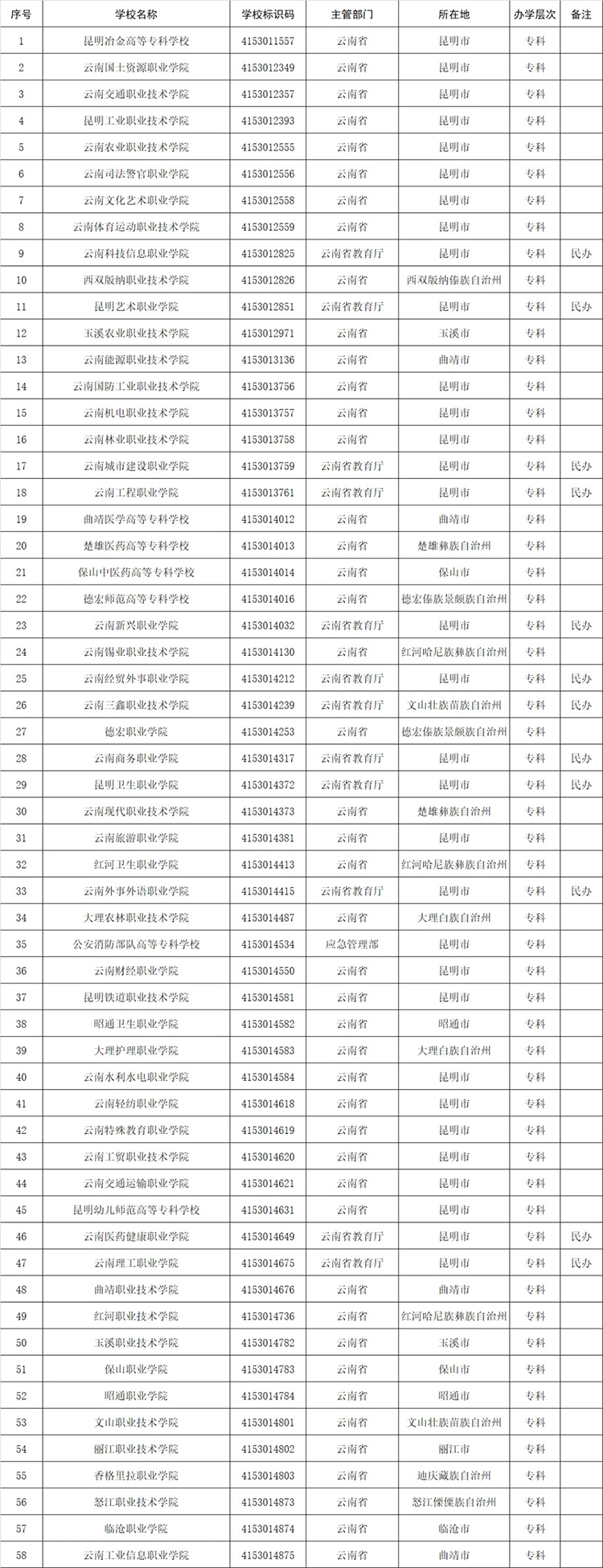 二十五、云南(58所)
