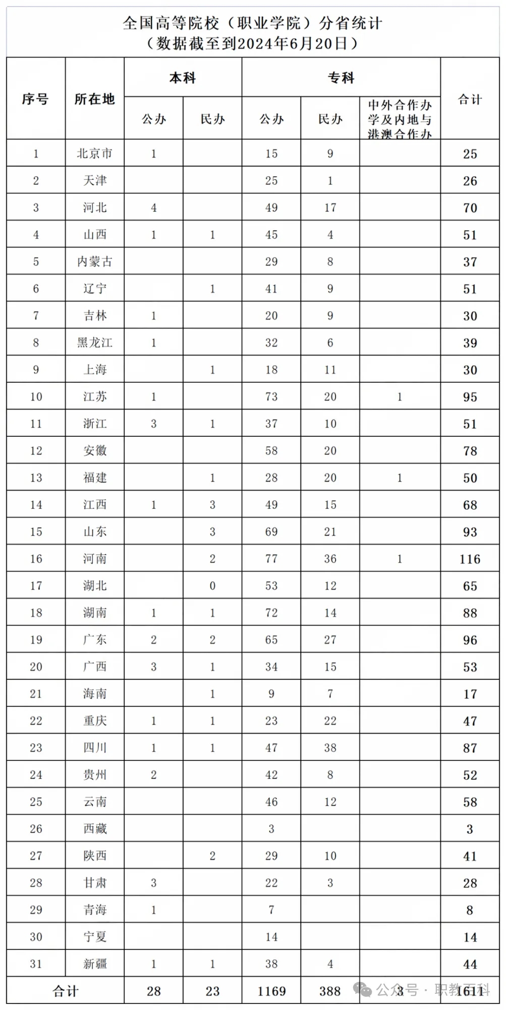 截至2024年6月20日,全国共有1611所高职院校,其中专科层次职业学校1560所,本科层次职业学校51所。共有1197所公立职业学校,414所私立和中外合作办学学校。