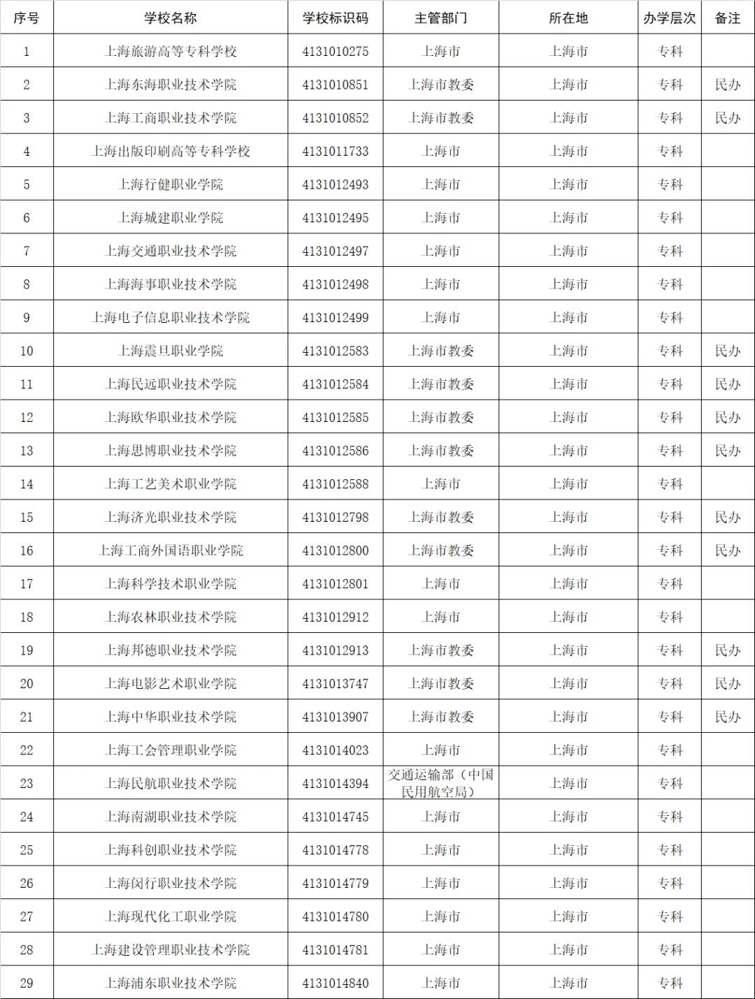 上海(29所)