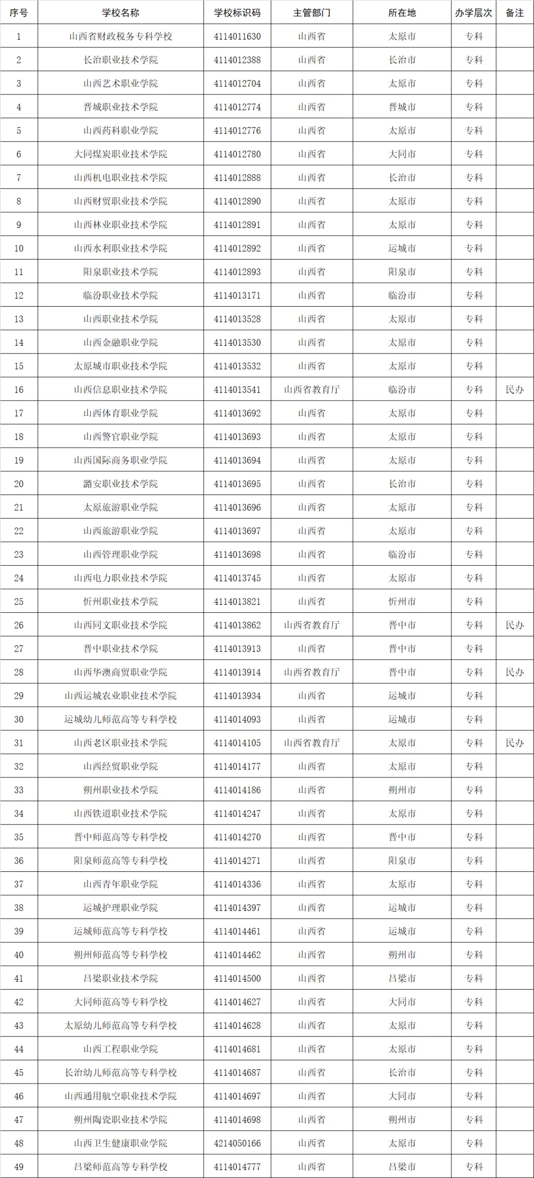 四是山西(49所)