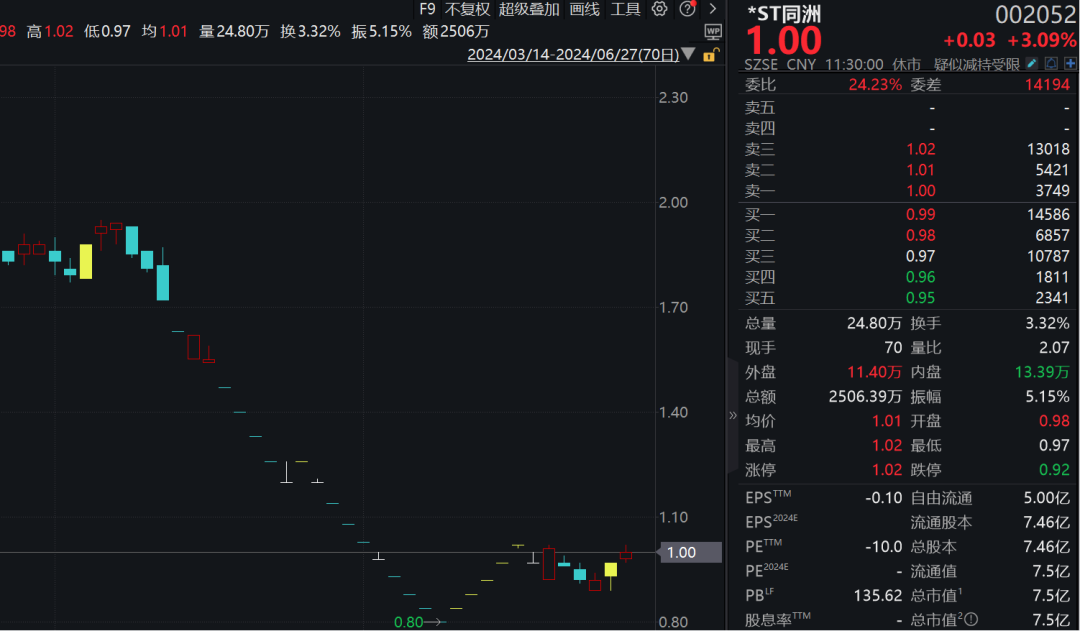 早些时候,*ST同洲一度涨停,股价一度回到1元以上。