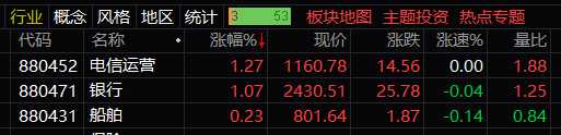 板块:电信、银行、船舶等少数板块逆势上涨,其他板块均下跌,通用机械、有色、化工、工程机械、汽车、房地产、通信等板块下跌2%以上。