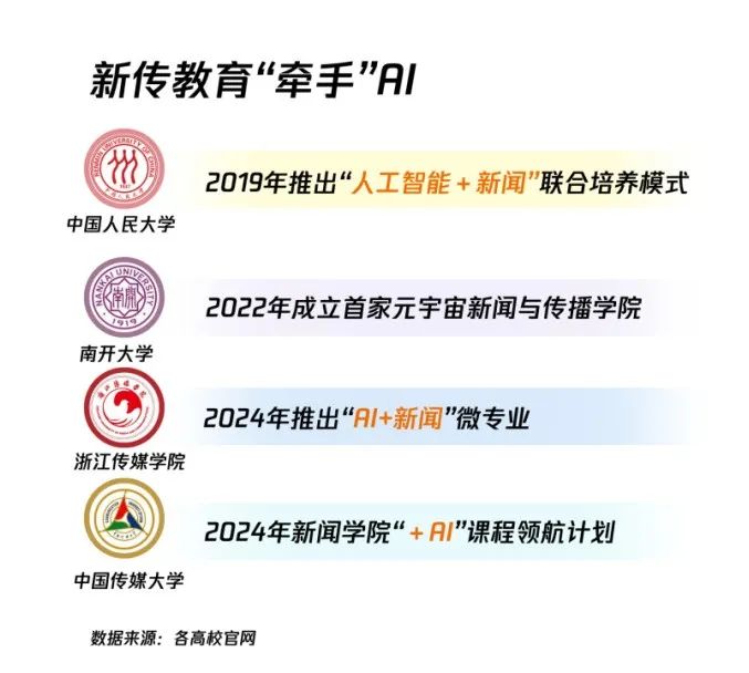 举例来说,在数字化背景下,新传教育与AI的融合已经成为一种趋势。2019年,中国人民大学推出“人工智能” “新闻”联合培训模式,探索新传教育创新;2022年,南开大学成立了全国第一个元宇宙新闻传播学院;2024年,浙江传媒学院成立了第一个“AI 近日,中国传媒大学也开设了“新闻”微专业; AI“课程领航计划,旨在全面培养学生的人工智能素养。