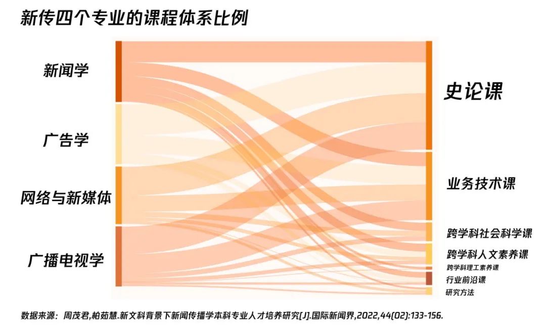 不仅如此,在“新文科、新工程”建设的背景下,新闻传播学也在不断调整人才培养计划。传统的新闻编辑人才培养正在被更符合社会需求的复合型人才培养计划所取代,新闻传播学科的人才培养正逐渐向数据科学和计算机信息科学倾斜,呈现出文理融合的“文转码”趋势。