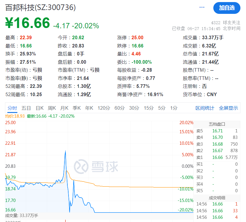 27日,百邦科技上市公司股价异常。11点前,股价一度上涨7%以上,随后瞬间崩盘。截至收盘股价“20CM”跌停,盘中振幅高达27%。如果在最高点买入,收盘时会损失25%以上!