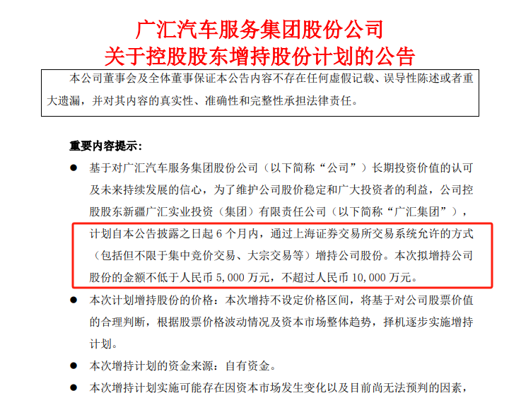 六月三日,广汇汽车股价突然下跌,公司当晚披露了控股股东和部分高管增持股份的计划。自公告披露之日起6个月内,公司控股股东广汇集团计划加持公司股权,拟加持金额不低于5000万元,不超过10000万元。与此同时,公司部分董事、监事、高级管理人员也计划在公告披露之日起6个月内加持公司股权,计划加持金额不低于130万元,不超过230万元。