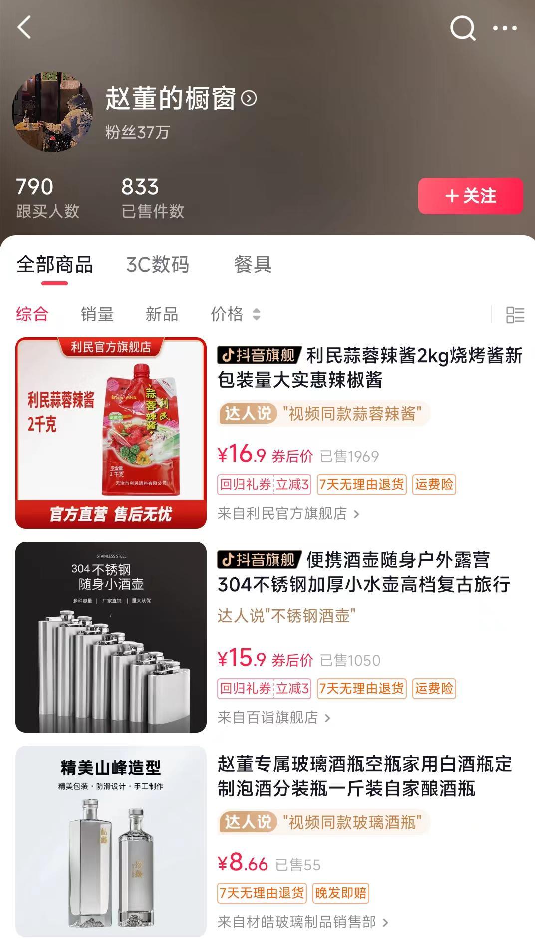 以博主“赵董”的窗口为例。抖音显示,他已经从窗口卖出了833件商品,购买人数达到790人。“湖南第一酒蒙子”的窗口卖出了150件商品,购买人数为142人。可以看出,他们几乎都是“买一次就够了”的一次性客户。
