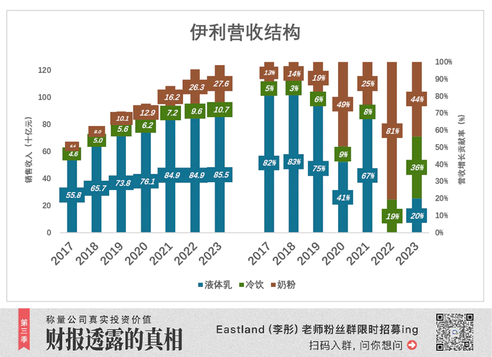 伊利液体乳业务在2021-2023年几乎停滞不前,奶粉收入稳步增长,保持奶制品收入增长;