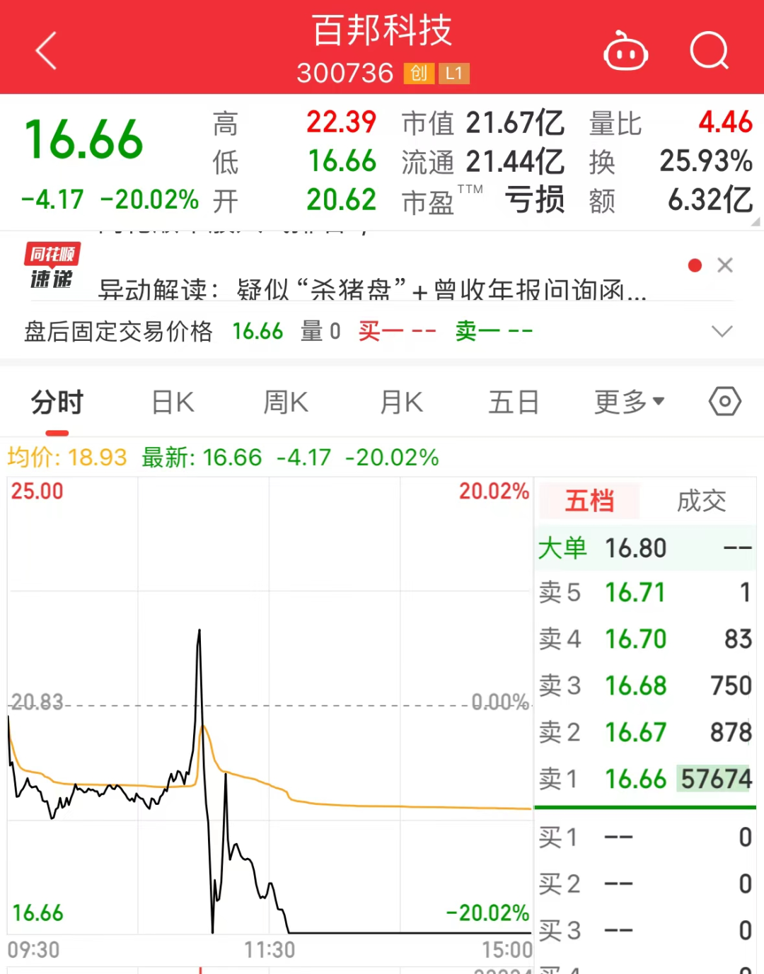 6月27日,百邦科技股票价格剧烈波动。公司股价开盘至10时50分左右,仍处于下跌状态。从10时53分开始,其股价开始大幅上涨;10时58分,股价从之前的近6%下跌,大幅飙升至近7%,随后大幅下跌,11时04分闪崩。在开盘收盘之前,该股再次反弹至下跌6%,然后再次下跌。下午13时09分,百邦科技20cm封闭跌停,盘中最大“暴跌”幅度超过26%。