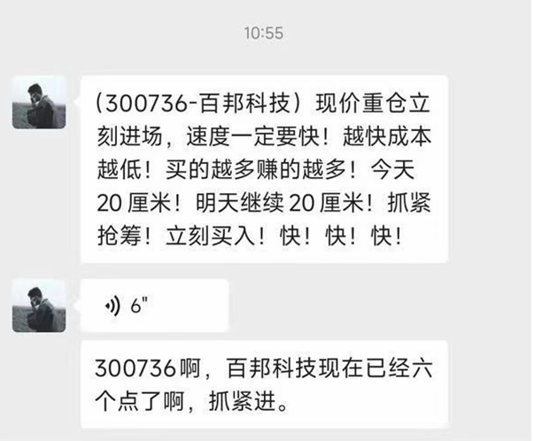 中午,一些投资者在社交网络上发布了许多聊天记录,其中显示许多“股票推荐老师”推荐百邦科技,并发言要求群友“立即购买”。截图显示,这些推票的时间点大多集中在10点55分左右,正好在百邦科技闪崩前三分钟。根据股吧信息,部分投资者因此中招,也有不少投资者呼吁撤销推荐股群并认真整顿。
