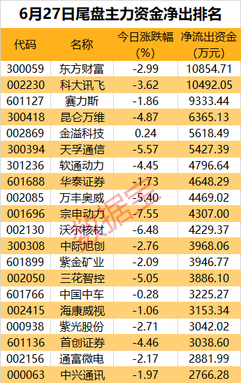 根据资料宝统计,收盘2股主力资金净流出均超过1亿元,分别为1亿元,东方财富,科大讯飞。