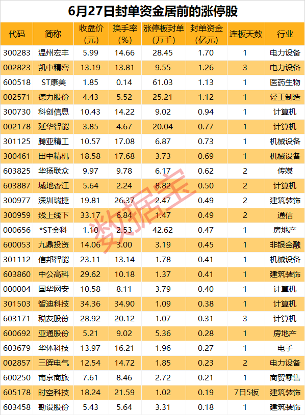 根据封单金额计算,4股封单金额超过1亿元,温州宏丰,凯中精密,ST康美。封单资金分别为1.7亿元、1.26亿元和1.13亿元。