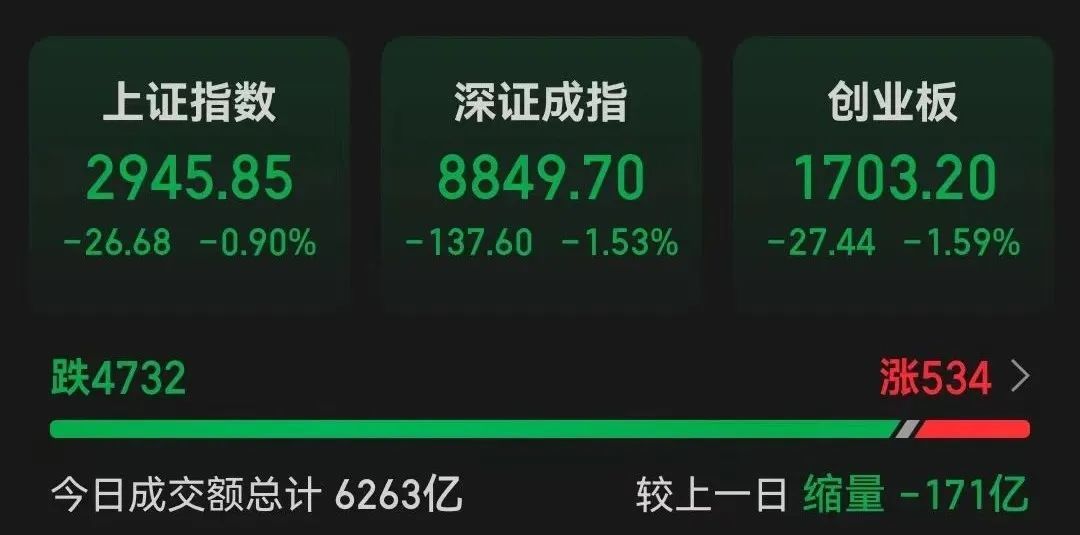 三大a股指数今日集体下跌,截至收盘,上证指数下跌0.90%,深证指数下跌1.53%,创业板指数下跌1.59%。沪深股市成交额为6263亿元,较上日缩水171亿元。