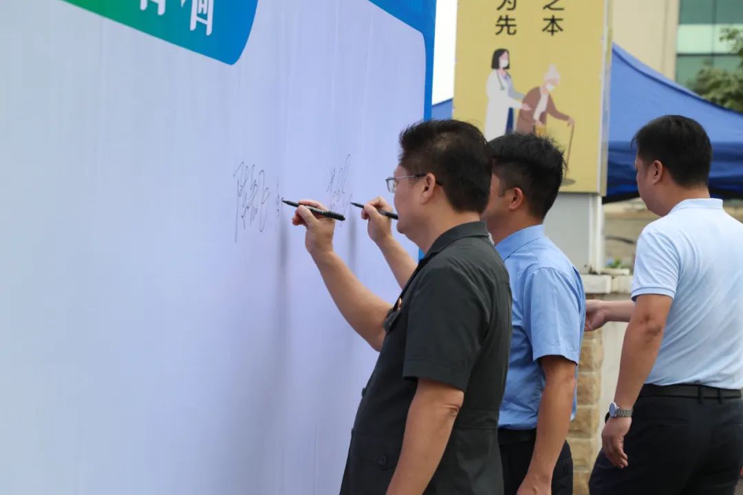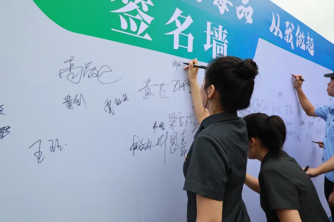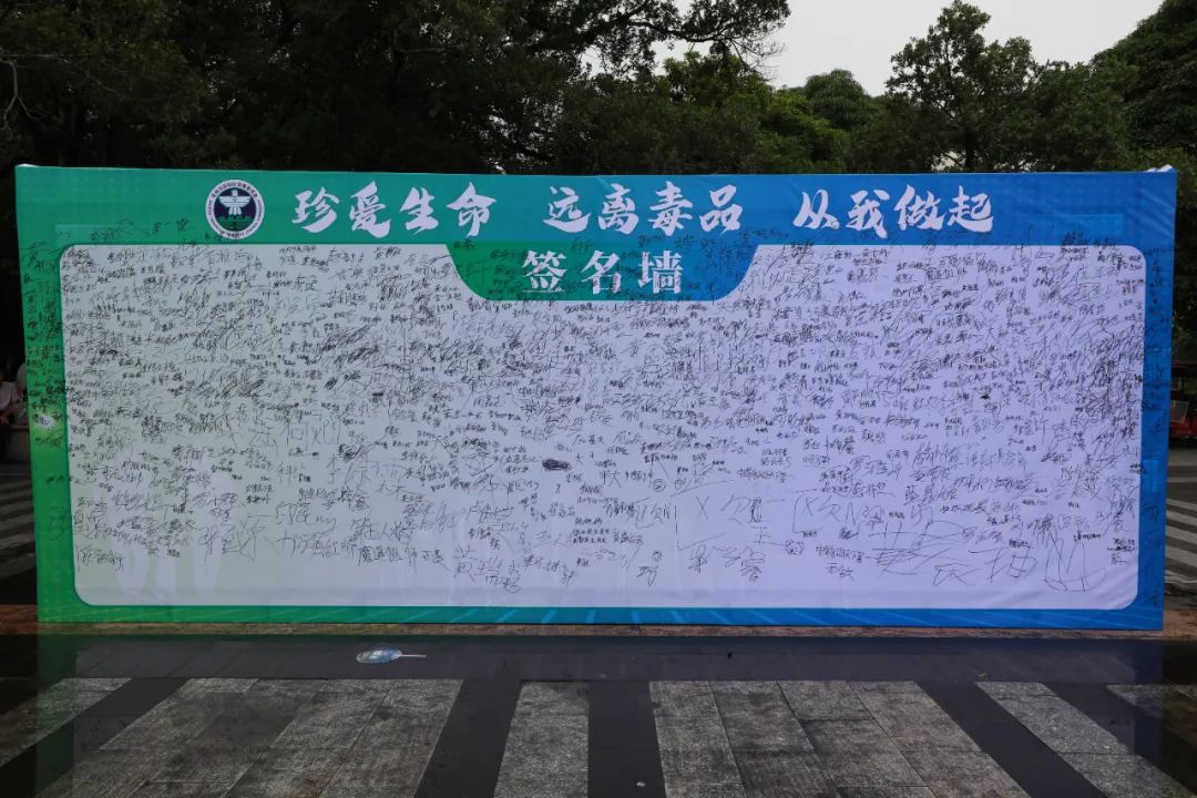 在活动启动仪式上,参加活动的单位成员和志愿者在禁毒签名墙上签字。随后,各队成员迅速集中在展台前进行禁毒集中宣传活动。