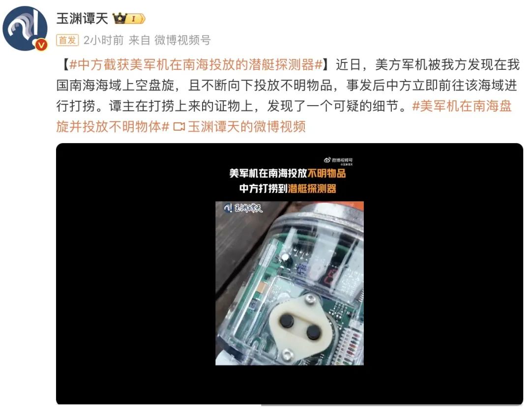 6月26日,据@玉渊谭天报道,近日,美国军用飞机被我们发现在中国南海水域上空旋转,未知物体不断向下投放。事发后,中国立即前往水域打捞,并依法检查不明电子物品。