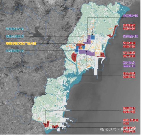 规划识别了城中村、老旧小区、老旧小区等7种更新资源。明确指出五大更新策略:“建设特色区、建设宜居社区、创新空间、建设蓝绿空间、补充设施短板”。通过挖掘区域特色更新要素,重点规划了14个特色区域,确保资源的合理分配和高效利用。14个区域包括日照路西区、海曲公园区、学苑路区等6个实施区、石臼老街区、海曲老城区商业区、滨海渔民感受区等7个规划更新区,以及已更新的海曲印象文化广场区。