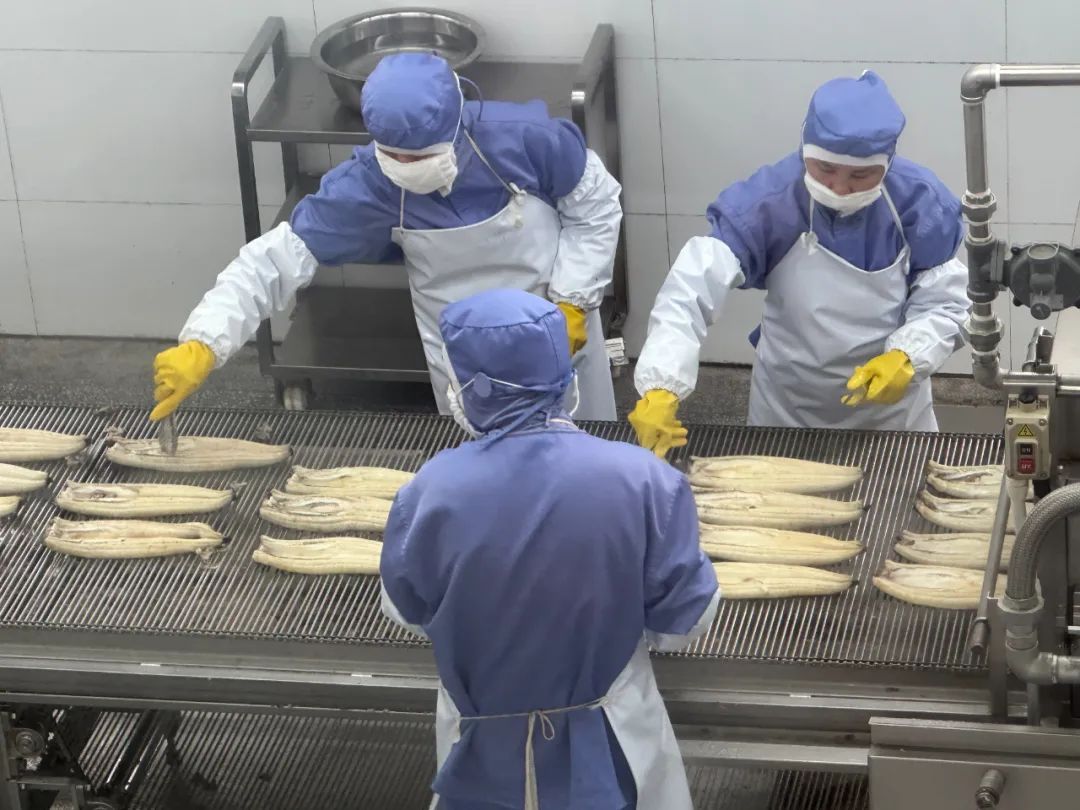 工人们在烤鳗加工线上工作。农民日报·中国农业网记者 杨惠 摄