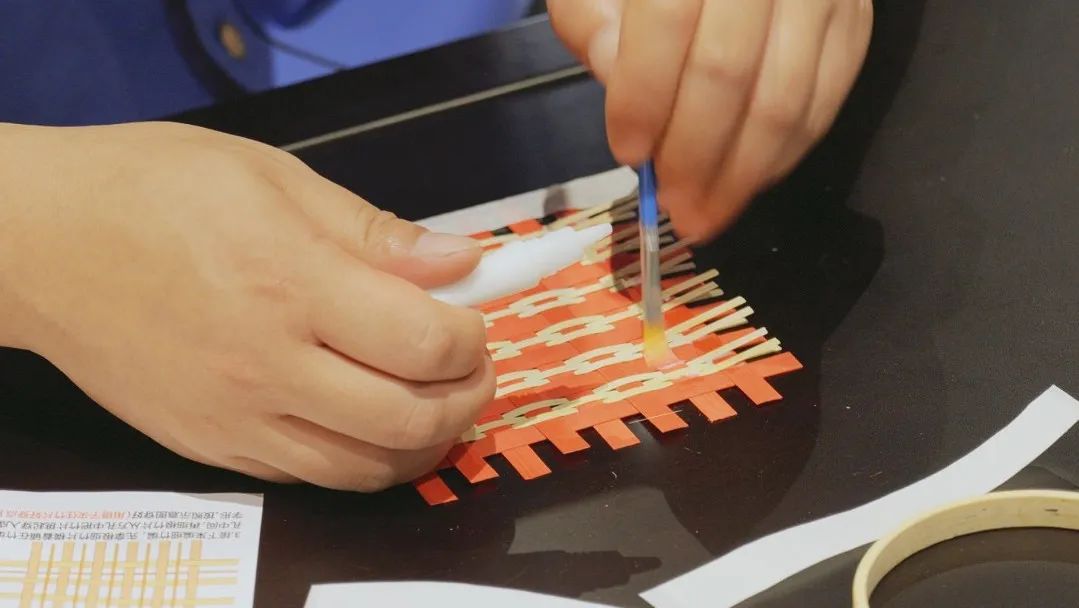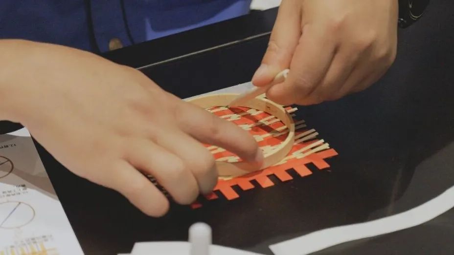 对半切断细竹条,按“压一挑一(隔一挑一)、挑一压一(挑一个隔一个)”的排列顺序,用红竹条和细竹条编织自己想要的图案,尽量把竹条间隙卡紧;