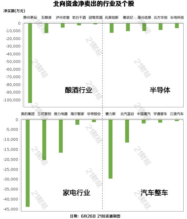北向资金减持 54 个别行业,其中酿酒行业最多,净销售额达到 12.74 亿元,其次是半导体行业,净卖出。 8.98 亿元。