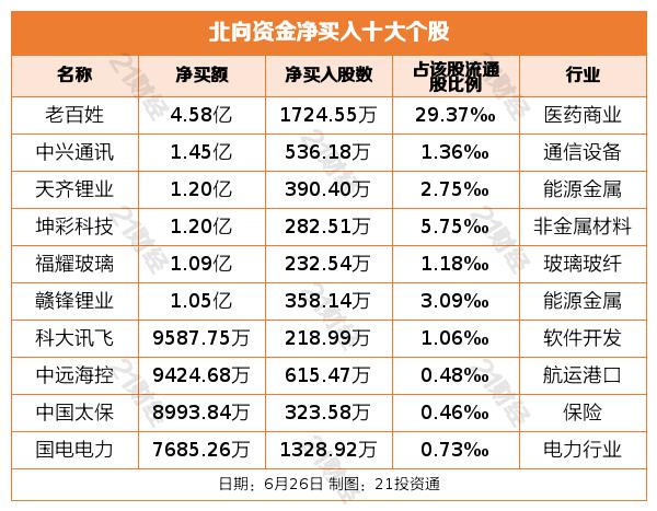 个股方面,北向资金净买入普通百姓。 ( 603883.SH ) 、中兴通讯 ( 000063.SZ ) 、天齐锂业 ( 002466.SZ ) 、坤彩科技 ( 603826.SH ) 、福耀玻璃 ( 600660.SH ) 居前,其中,普通百姓被净买入。 4.58 亿元,中兴通讯被净买入。 1.45 亿元,净买入天齐锂业 1.20 1亿元,坤彩科技被净买入。 1.20 亿元,福耀玻璃被净买入。 1.09 亿元。