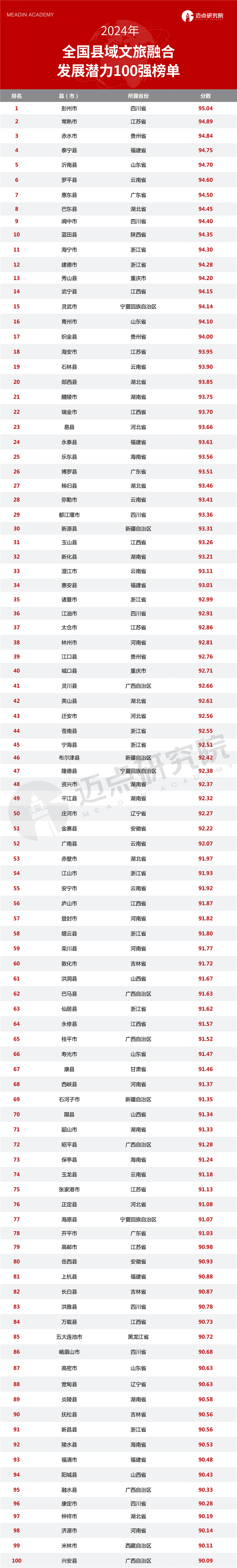 2024年全国文化与旅游融合综合竞争力100强榜单