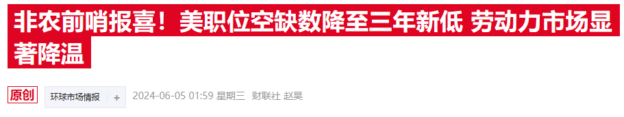 根据其他数据,美国劳动力市场的招聘活动明显放缓,5月份的失业率在过去两年中首次上升到4%,4月底的职位空缺也下降到了过去三年的最低水平。这就是美联储官员经常提到的“劳动力市场再平衡”。