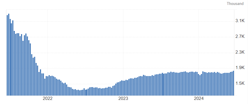 根据美国劳工部盘前公布的数据,截至6月15日的一周内,已有183.9万人持续申请失业救济,182.4万人高于市场预期,182.1万人高于上周调整后的182.1万人。上次达到这个水平还是在2021年11月。