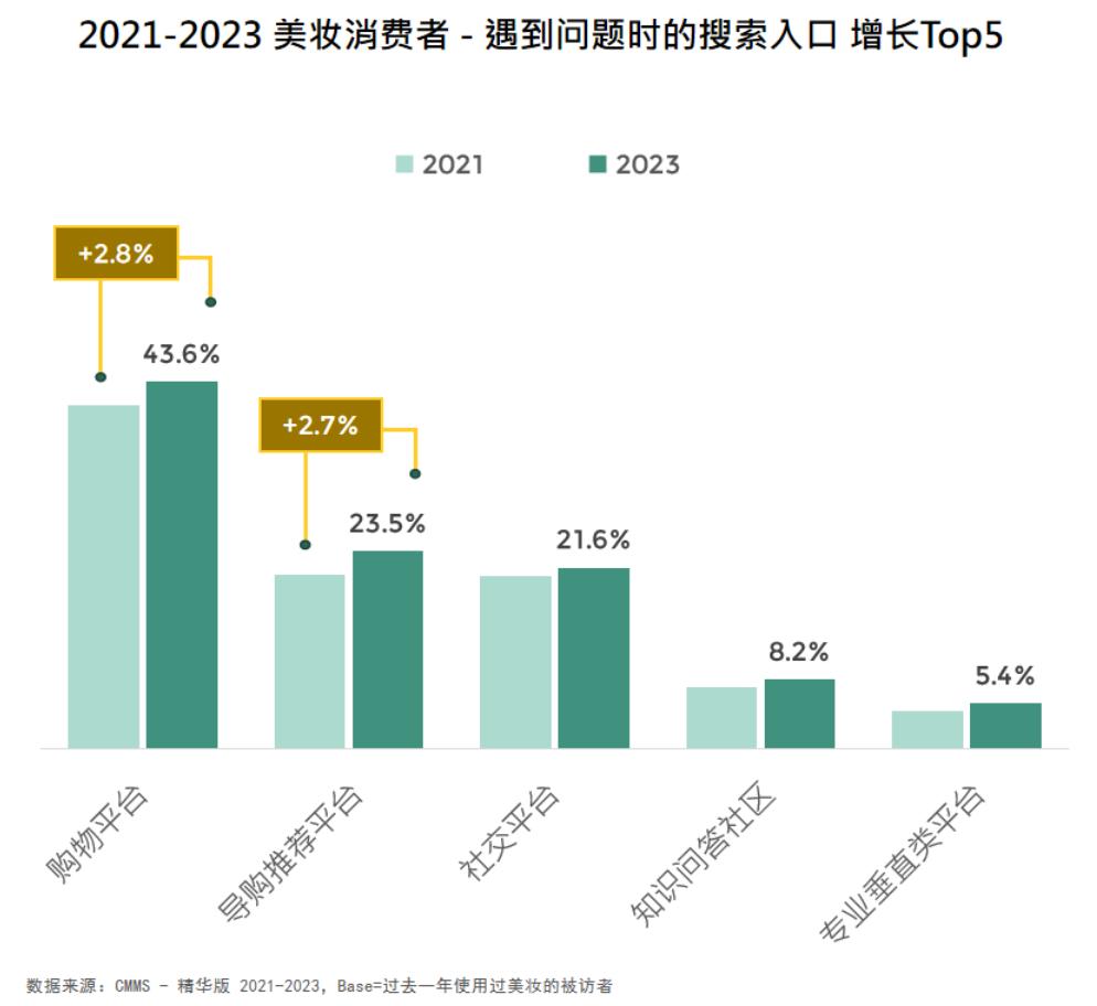 - 在遇到与美妆相关的问题时,他们在购物平台、导购平台上直接确认的比例不断增加。