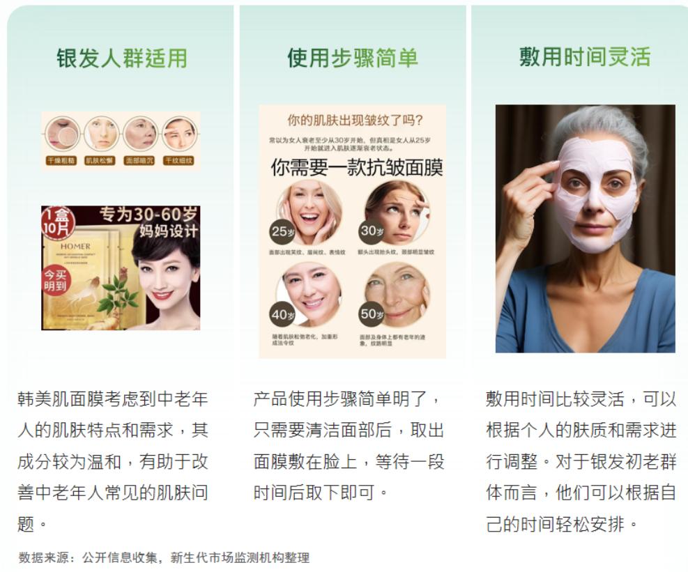 银发老年人面临复杂的皮肤问题,但不愿意增加护肤步骤。银发老年人需要面对干燥、松弛、色斑等复杂的皮肤问题,但不想增加复杂的护肤步骤。他们需要简单有效的解决方案。面膜类别具有高效易用的特点,可以帮助他们在不增加额外护肤步骤的情况下轻松改善皮肤问题。
