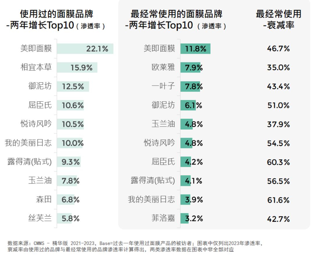 尽管曼秀雷敦和悦诗风吟在两个榜单中都名列前茅,但其衰减率分别为46.0%和32.7%,尽管增长强劲,但品牌在巩固用户忠诚度方面仍存在挑战。