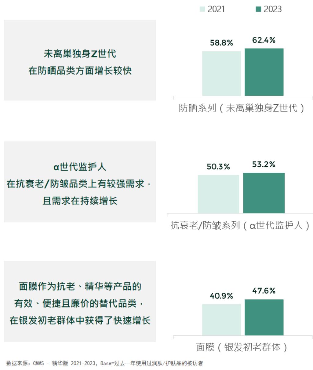 - 从Z世代对防晒的追求,到α一代又一代的监护人尽最大努力抵御岁月的痕迹,甚至银发老年人也青睐简单高效的口罩解决方案,洞察和响应不同一代人的核心需求将成为营销策略的赢家和输家。