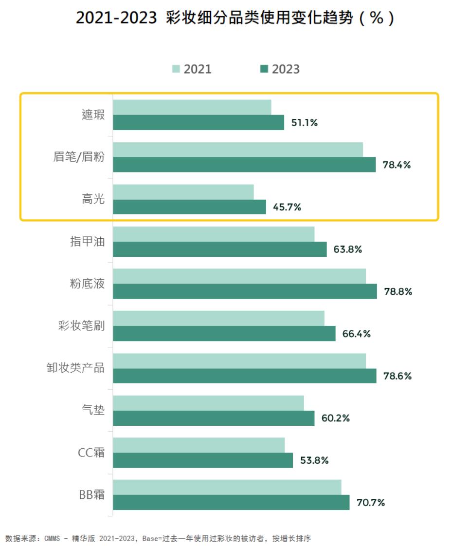 消费者对化妆的精细化需求日益增加,遮暇和高光品类特别受欢迎,渗透率明显上升。