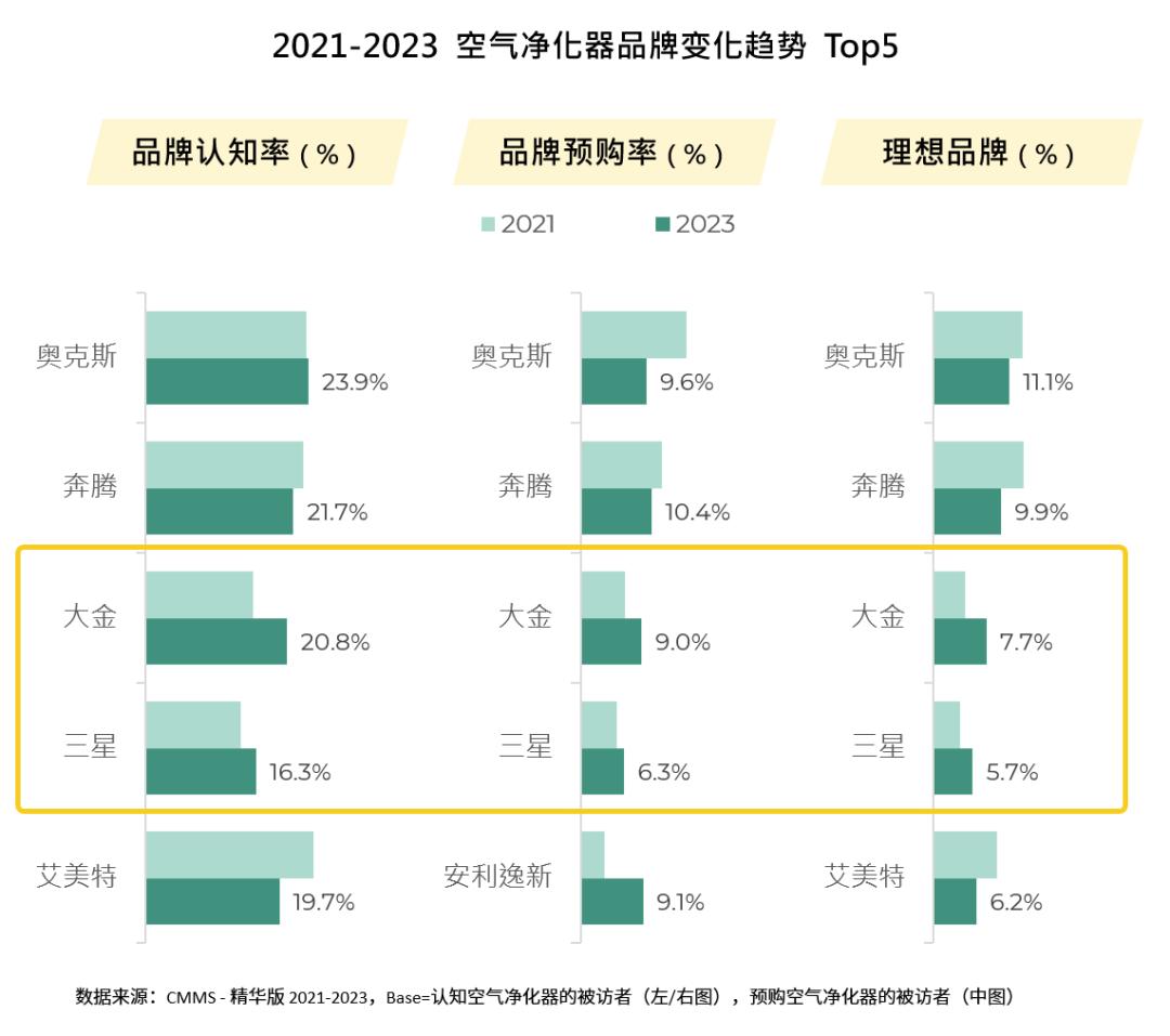 在空气净化机市场上,大金和三星呈现出稳步增长的趋势,品牌认知率、预订率和理想品牌比例均迅速上升。
