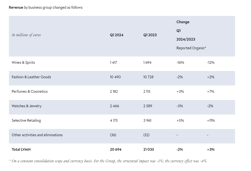 据LVMH集团此前发布的2024财年第一季度财务报告显示,集团销售额同比下降2%至207亿欧元,但有机收入增长3%。