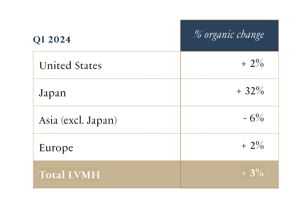 “虽然地缘政治和经济环境仍不确定,但该集团今年开局良好。”LVMH表示,欧洲和美国在本季度实现了以不变货币和合并范围为核心的增长;日本实现了两位数的收入增长;亚洲其他地区的下跌反映了中国用户在欧洲和日本的强劲支出增长。
