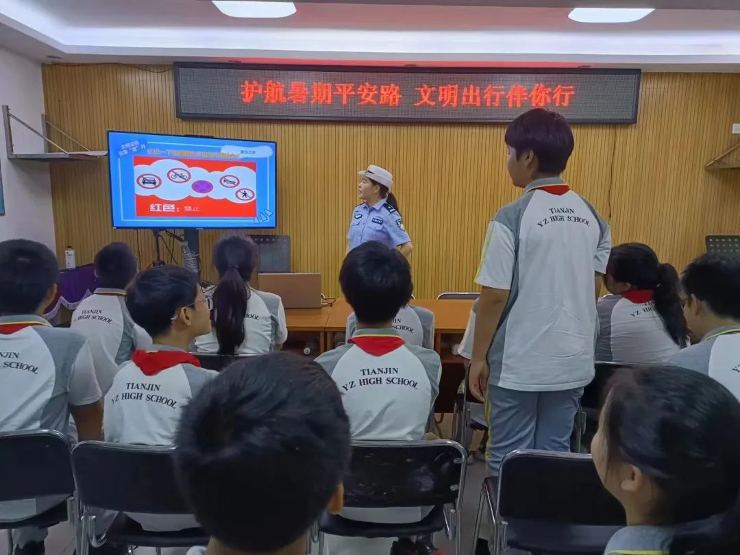 "暑假马上就要放了,大家都很兴奋,也很期待。假期里,每个人都有很多时间做自己想做的事情,所以无论是和父母还是同学出去,都要注意交通安全,文明守法,做好自己的安全防范。7月1日上午,在新兴街兴河社区,交警魏孟君边说边操作电脑,在大屏幕上播放了提前制作的交通安全宣传PPT课件。天津益中学一年级学生和家长的注意力突然被吸引。
