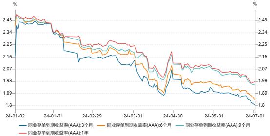 六月下半月,同业存单回报加速下降。由于AAA级同业存单到期收益率在一年内突破2.0%的关键位置,同业存单回报率正式进入“1”时代。据分析,商业银行资产负债扩张放缓,缓解了存单供应压力。跨季度叠加资金面干扰较小,“资产短缺”持续,推动同业存单利率下降。下半年,银行续发同业存单的压力进一步缓解,“资产短缺”仍对同业存单给予有力支持。