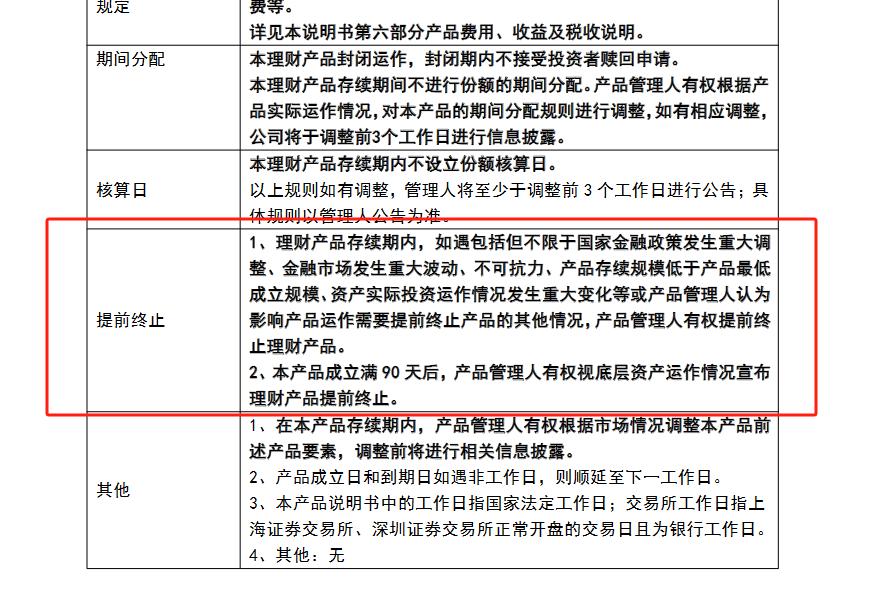 根据产品手册的提前结束条款,在成立满满 90 天后,商品管理员有权根据底层资产的运作情况提前宣布理财产品的结束。