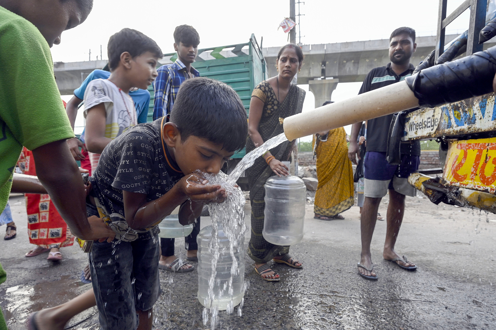 2024年6月25日,印度新德里水资源短缺,人们在高温下排队领取饮用水。