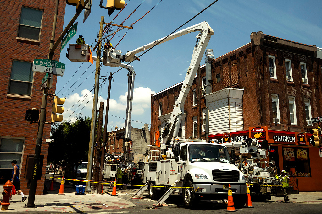 美国费城,当地时间2024年6月21日,维修人员在高温下修理电线。