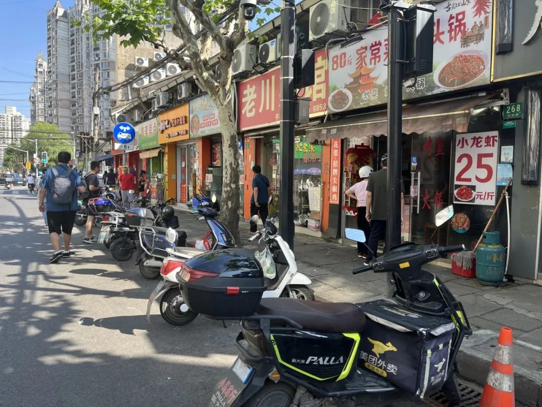 其实这个路口有一个非机动车停放的规定区域,但是乱停还是很突出的。周边商家也很苦恼。“一般客人来吃饭的时候都是直接停在路边,乱停车也会影响大家的生意。”