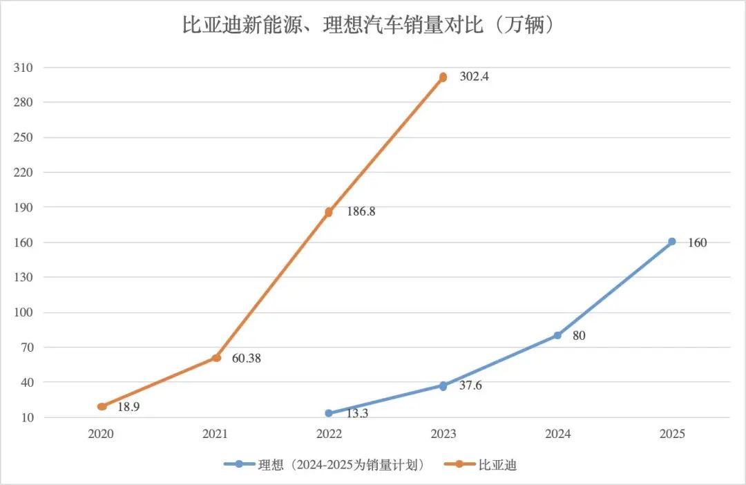 按照理想的计划,2025年销售额为160万辆,连续4年实现100%增长。这个神话几乎会复制比亚迪新能源汽车的增长。