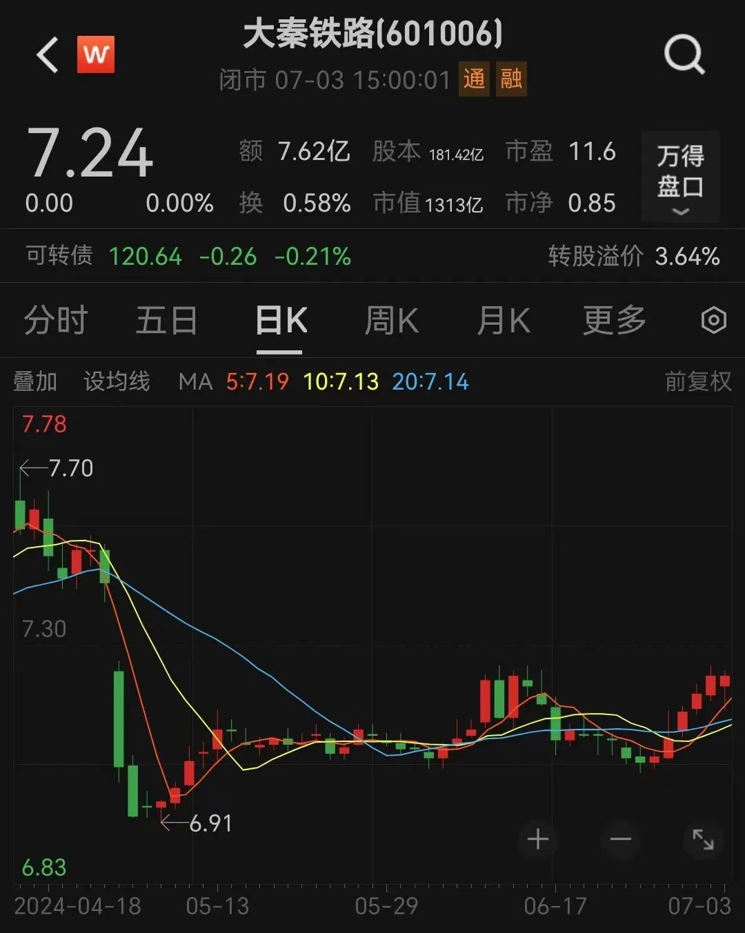 七月三日收盘,大秦铁路股价7.24元,市值1313亿元。